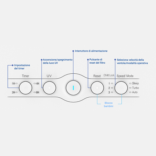 La luce UV-C si è dimostrata efficace nell'eliminare diversi virus e batteri. Spezzando i legami molecolari del DNA/RNA dei virus, la luce UV-C impedisce ai virus e ai batteri di riprodursi. Il purificatore d'aria EZVIZ irradia l'aria purificata con una luce UV-C prima di immetterla nella stanza. La concentrazione di ioni negativi è uno dei criteri principali per valutare la qualità dell'aria. Il purificatore d'aria EZVIZ UV-C genera milioni di ioni negativi per deodorare e rinfrescare la stanza in modo rapido ed efficace. Il purificatore d'aria EZVIZ UV-C consente di impostare la velocità della ventola; con il timer integrato si possono selezionare i tempi di funzionamento. Il prodotto indica se l'aria presente nella stanza è pulita e se l'ambiente interno è sano o meno, grazie al display anteriore che mostra in sequenza la concentrazione di PM2,5, il tasso di umidità e la temperatura della stanza. Il dispositivo è incredibilmente facile da usare e ogni attività si svolge sul dispositivo stesso.