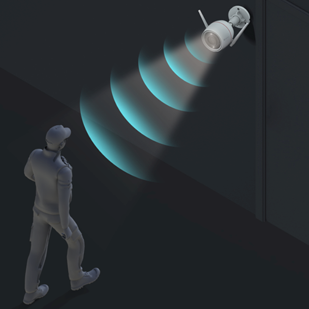 La telecamera H3c 2K si integra con la tanto apprezzata funzione di difesa attiva di EZVIZ in modo da garantire una protezione aggiuntiva. Una volta rilevati degli intrusi, la telecamera avvia una sirena e attiva i due faretti⁴ lampeggianti come deterrente.
