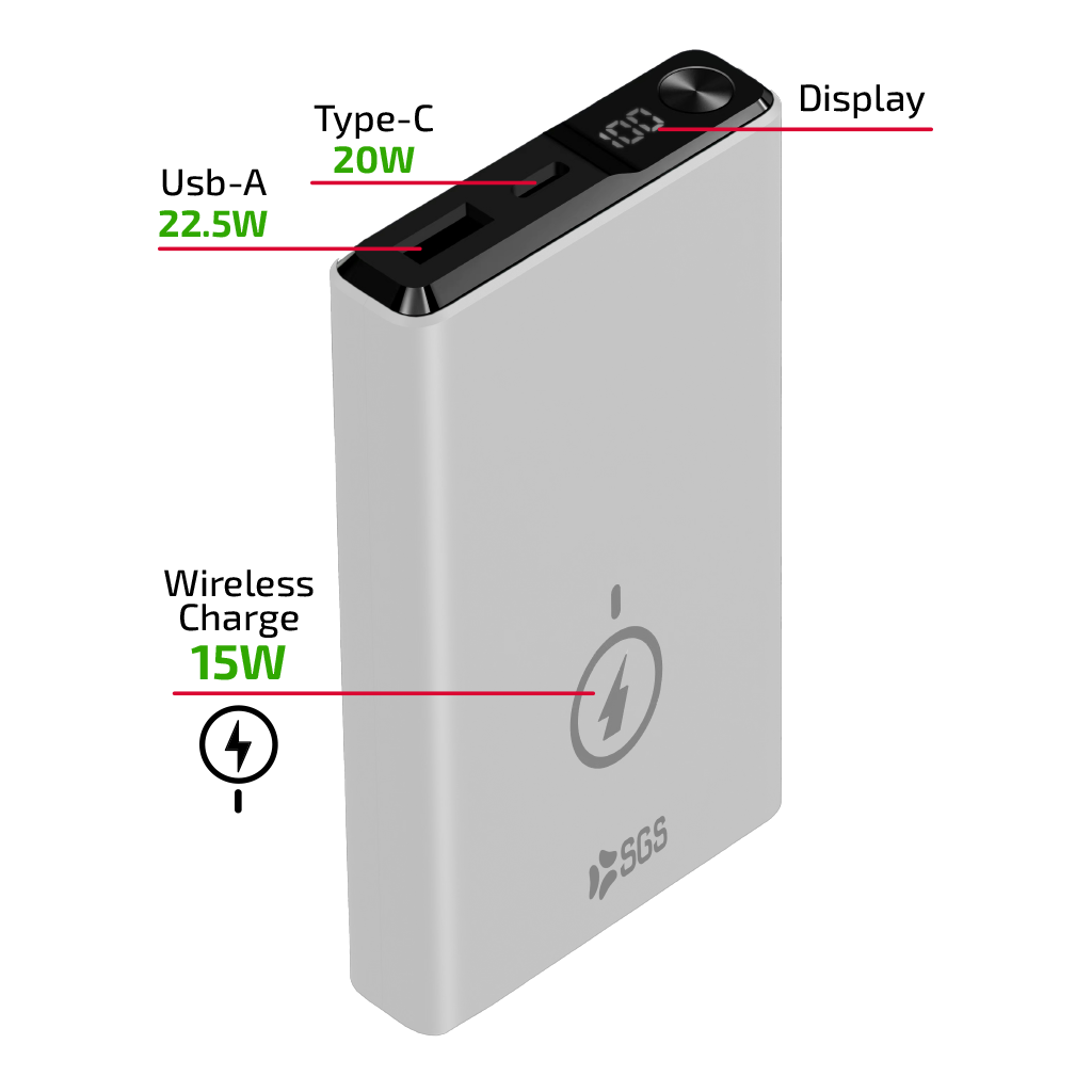 Dotato di ricarica Wireless magnetica 15W, questo Powerbank SGS da 10.000mAh è in grado di garantire fino a 4 ricariche complete*.