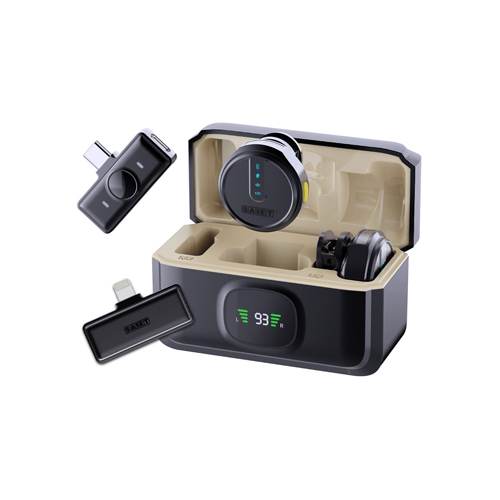 Audio Mic è un kit composto da 2 microfoni wireless con clip, 2 trasmettitori (1 con connettore Type-C e 1 con connettore Lightning) e custodia di ricarica.